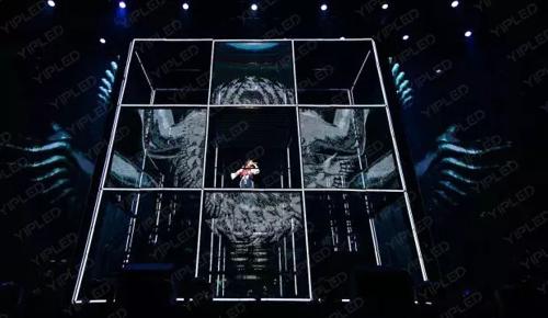 由壹品冰屏搭建的透明旋轉魔方,既能兼作背景,成為兩側和大屏絢爛視效的骨架,也能在特定時刻變成獨立空間,為周筆暢提供能拾級而上的旋轉鐵梯。逆天數字舞美,呈現出極具“未來感“的魔幻視效。